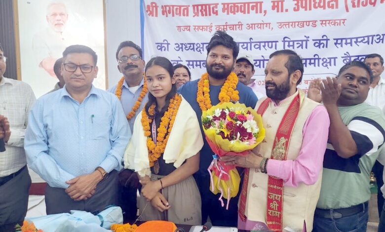 देहरादून, 04 जून। उत्तराखंड राज्य सफाई कर्मचारी आयोग के उपाध्यक्ष (राज्यमंत्री) भगवत प्रसाद मकवाना ने आऊटसोर्स स्वच्छता कर्मचारियों के विरुद्ध कार्यवाही से पूर्व स्पष्टीकरण लेने के नगर निगम प्रशासन को सख्त निर्देश दिए l साथ ही उन्होंने वरिष्ठता के आधार पर पदोन्नति के निर्देश भी दिए। राज्यमंत्री ने नैशनल पॉवर लिफ्टिंग 52 किग्रा वर्ग में गोल्ड मेडल विजेता वाल्मिकी समाज की छात्रा मुस्कान जिनवाल को माला पहनाकर सम्मानित किया। राज्य मंत्री मकवाना ने ऋषिकेश नगर निगम विभागों की समीक्षा बैठक की। उन्होंने देश के प्रधानमंत्री एवं मुख्यमंत्री उत्तराखंड द्वारा संचालित जन कल्याणकारी योजनाओं का शत प्रतिशत लाभ जरूरतमंद लोगों तक पहुंचाने के निर्देश दिए। उन्होंने आगामी बोर्ड बैठक में प्रस्ताव लाकर कर्मचारियों की संख्या बढ़ाने एवं पद सृजन के लिए राज्य सरकार को प्रस्ताव भेजने को कहा। “मैन्युअल स्कैवेंजर्स एक्ट” की जानकारी न होने पर नाराजगी जाहिर की “नमस्ते योजना” का गंभीरता से पालन करने के निर्देश दिए। सीवर सफाई कार्यों के दौरान कर्मचारियों को संपूर्ण सुरक्षा उपलब्ध कराने एवं सफाई कर्मचारियों के परिवार के स्वरोजगार एवं शिक्षा हेतु ऋण उपलब्ध कराने के निर्देश दिए। उन्होंने स्वच्छता कर्मचारियों के लिए गोल्डन एवं आयुष्मान कार्ड के लिए 15 दिन के भीतर शिविर लगाने के निर्देश दिए। राज्यमंत्री श्री मकवाना ने शहर में प्रमुख चौराहा चिन्हित कर महर्षि वाल्मीकि चौक बनाने के नगर निगम प्रशासन को निर्देश दिए। समीक्षा बैठक में राज्य सफाई कर्मचारी आयोग में सदस्य राकेश पारचा, ऋषिकेश नगर निगम आयुक्त शैलेन्द्र सिंह नेगी, सहायक नगर आयुक्त के अलावा समाज कल्याण, जल संस्थान, पुलिस एवं स्वास्थ्य विभाग के अधिकारी भी मौजूद रहे।
